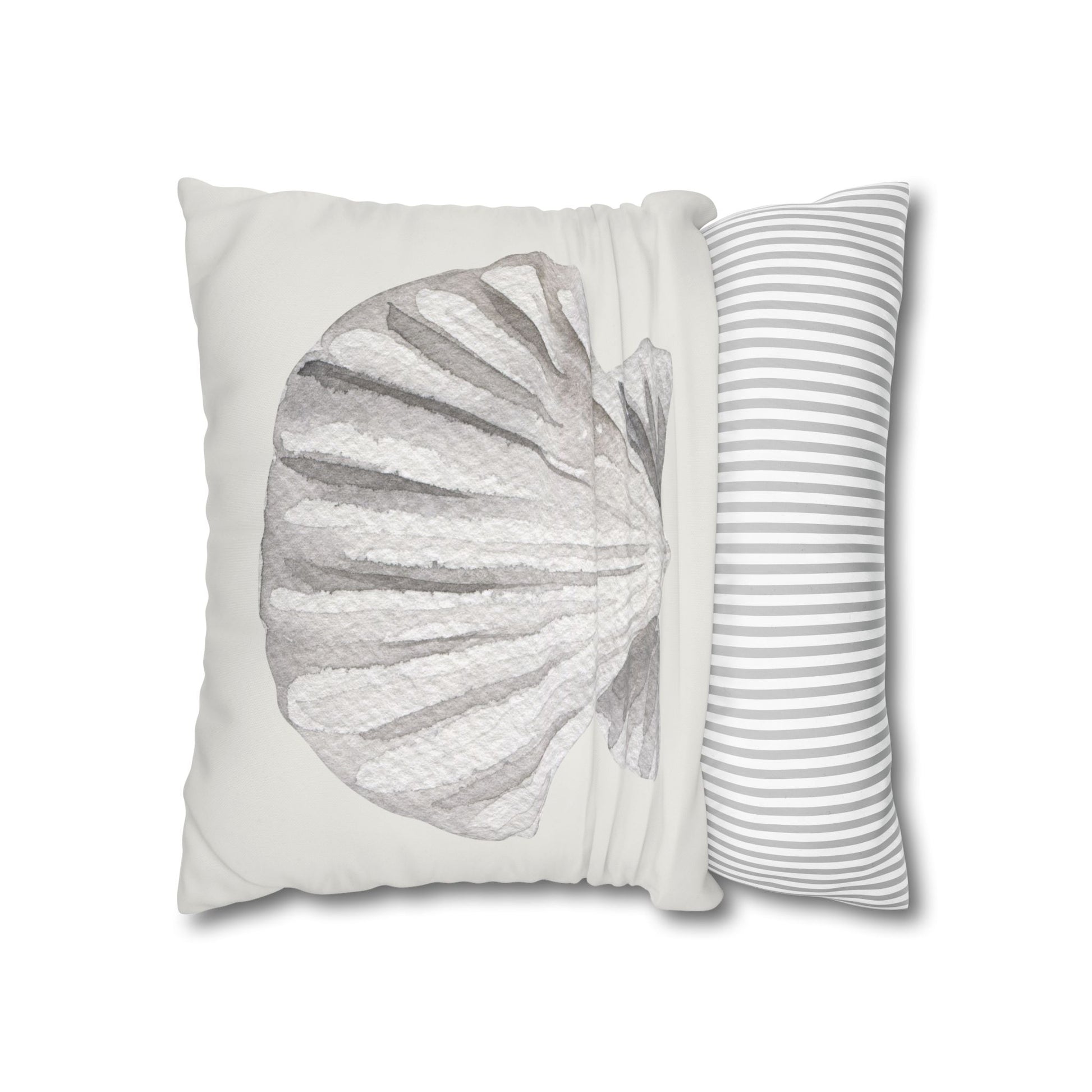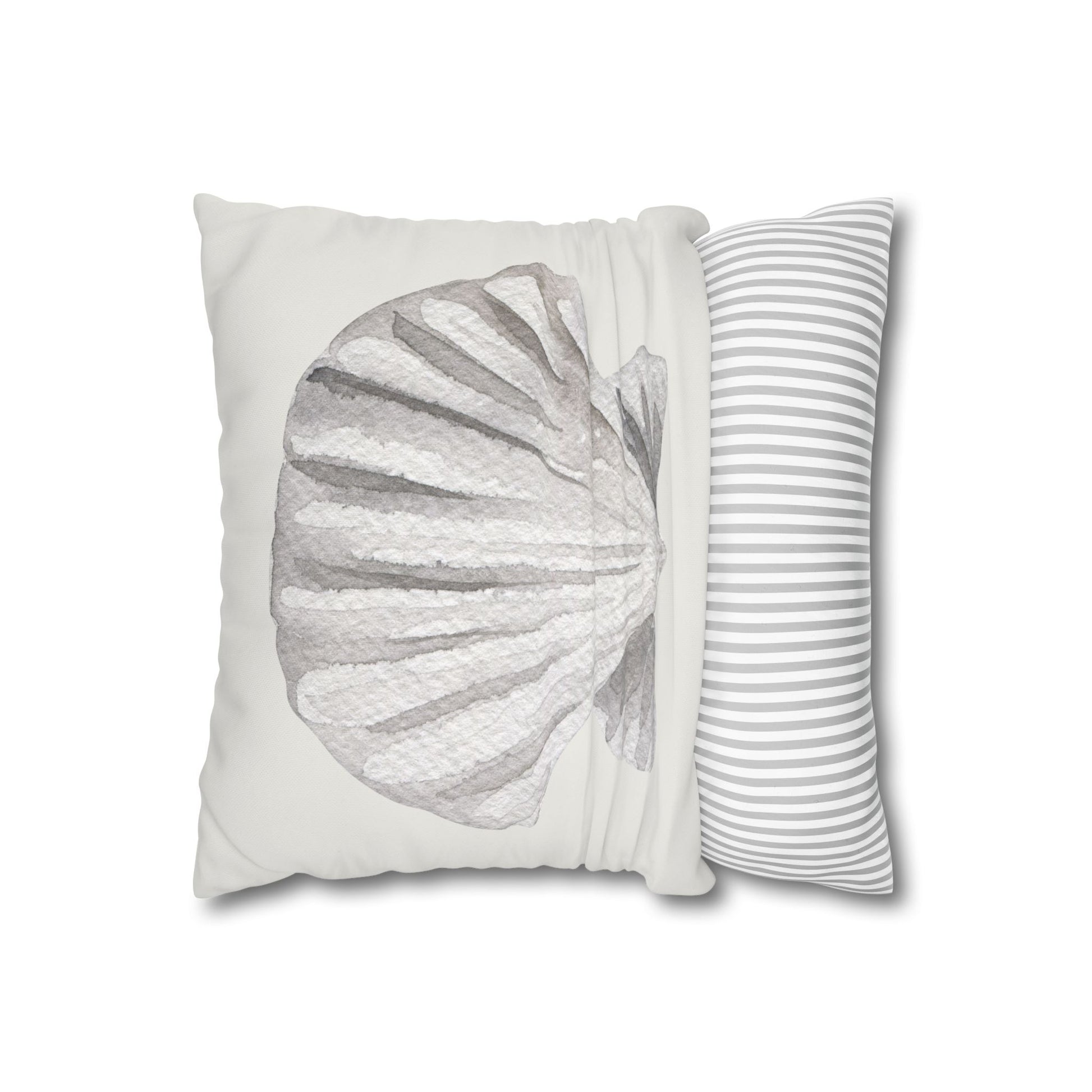 This scallop seashell pillow cover features a softly layered watercolor design rendered in gentle, neutral tones for a refined coastal look. The fan-shaped form of the scallop shell is highlighted through subtle shading and texture, creating depth while maintaining a calm, minimalist aesthetic.